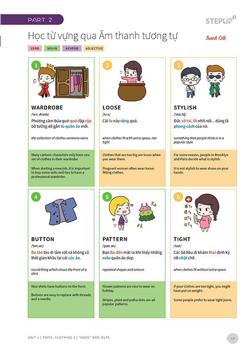 Bước 4: Học từ vựng qua Âm Thanh Tương Tự được  bẻ khóa sẵn. Từ học thuật và khó nhớ tới đâu cũng  thấm vào trí nhớ của bạn cực kì dễ dàng. Tại sao  Step Up lại phải vẽ tay từng hình cho mỗi từ vựng?  Bởi vì hình ảnh sẽ giúp tăng tới 50% hiệu quả ghi  nhớ và gợi nhớ từ vựng.